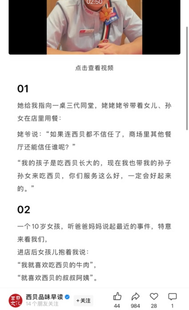 最近該公眾號的推文內(nèi)容,充滿了西貝員工“感激、信任老板”的說辭,同時也引用了很多消費者的說法,比如“如果連西貝都不信任了,商場里其他餐廳還能信任誰呢?”“我的孩子是吃西貝長大的,現(xiàn)在我也帶我的孫子孫女來吃西貝,你們服務(wù)這么好,一定會好起來的”,甚至還有“我跟西貝同生共死”這樣讓人大跌眼鏡的言論。