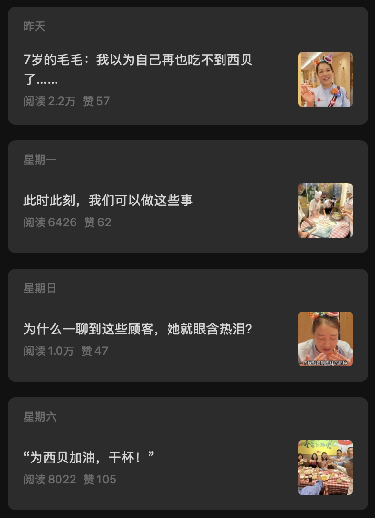 源Sight注意到,從推文內(nèi)容看,該公眾號似乎是一個西貝對基層員工進行公司文化和經(jīng)營情況宣傳的出口,而該號近期的文章內(nèi)容,大多與“感恩西貝、感謝老板”“共渡難關(guān)”有關(guān)。