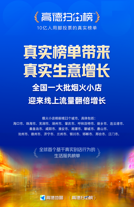 9月25日,聯(lián)商網(wǎng)從高德獲悉,9月10日高德掃街榜發(fā)布以來(lái),全國(guó)一大批煙火小店迎來(lái)了線上流量的翻倍增長(zhǎng)。為了進(jìn)一步支持各地?zé)熁鹦〉,今天開(kāi)始,高德在原來(lái)61城的基礎(chǔ)上,進(jìn)一步為海口、珠海、秦皇島等22座城市開(kāi)設(shè)煙火小店榜。