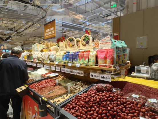 特別是干貨雜糧類,增加了燕之坊、興合豐、腌臘坊等專區(qū)專柜,并且片區(qū)位于賣場(chǎng)中央,整體人氣也比較高。