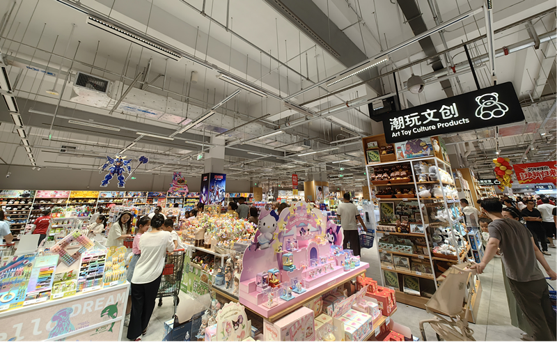 新開(kāi)門(mén)店現(xiàn)場(chǎng),品類集合店特征還是比較明顯。入口處左手邊的潮玩文化、一樓轉(zhuǎn)角處的家電、家紡區(qū),都出現(xiàn)明顯的場(chǎng)景集合店化,大量使用矮堆和集合方式進(jìn)行陳列展示,使得顧客購(gòu)物的心理空間非常舒適。