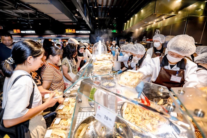 烘焙與熟食則煙火氣滿滿。新增現(xiàn)烤榴蓮千層、金秋桂花主題點心、現(xiàn)烤月餅等網(wǎng)紅單品;熟食區(qū)引入烤爐豬、北京烤鴨、現(xiàn)炒板栗、烤雞、壽司、披薩等多元即時品類,增強(qiáng)賣場“煙火氣”與年輕客群吸引力。
