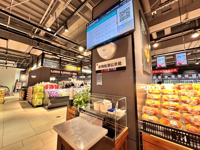 細節(jié)服務彰顯溫度:食品貨架配備放大鏡,方便老年顧客閱讀信息;連卷袋配備濕手器,解決手濕難撕袋問題;冷鏈區(qū)域配備防凍手套,海鮮區(qū)提供防刺手套;果切組合按甜度標注食用順序,購買整個西瓜、榴蓮等可享免費剝切服務。