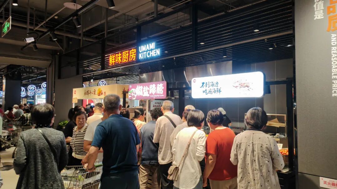 服務與環(huán)境方面,門店普遍取消強制動線,拓寬主通道,將中島貨架高度統(tǒng)一降至1.6米,營造開闊通透的購物空間。便民服務區(qū)成為亮點,配備身高體重秤、血壓儀、直飲水機、微波爐、充電寶、寵物安置區(qū)等設施。細節(jié)服務無處不在:食品貨架配放大鏡方便老人,連卷袋區(qū)設濕手器,果切按甜度標注食用順序,肉禽、海鮮區(qū)提供免費加工服務。嚴格的“468”鮮度管理原則及部分生鮮日清制度,確保了食材的新鮮與安全。