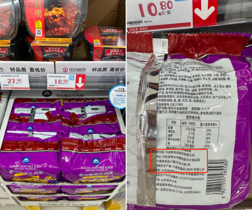 再比如,將“百嶼森”紅燒牛肉面(今麥郎代工)7連包僅10.8元/袋,陳列在海底撈27.9元/盒的麻辣嫩牛自煮火鍋旁,直擊價格敏感型消費者。