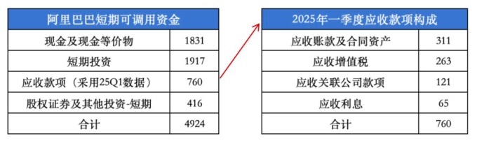 第一個(gè)層次對(duì)應(yīng)資金約4924億元:截至2025上半年,阿里巴巴賬面現(xiàn)金1831億元、短期投資1917億、短期股權(quán)證券及其他投資416億元、各類(lèi)應(yīng)收款項(xiàng)約760億(采用25Q1數(shù)據(jù)替代),公司短期可調(diào)動(dòng)資金4924億元。