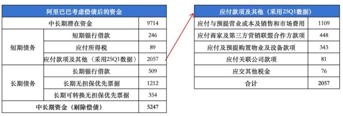 第三個(gè)層次對(duì)應(yīng)資金約5247億元:截至2025上半年,阿里巴巴短期負(fù)債(應(yīng)付款項(xiàng)及其他、短期借款、短期債券、應(yīng)付稅費(fèi))共2392億元,長(zhǎng)期負(fù)債(長(zhǎng)期借款、長(zhǎng)期債券、長(zhǎng)期票據(jù))共2075億元,合計(jì)4467億元。因此在考慮到負(fù)債的償還后,阿里巴巴能夠動(dòng)用的最大資金量約為5247億元。