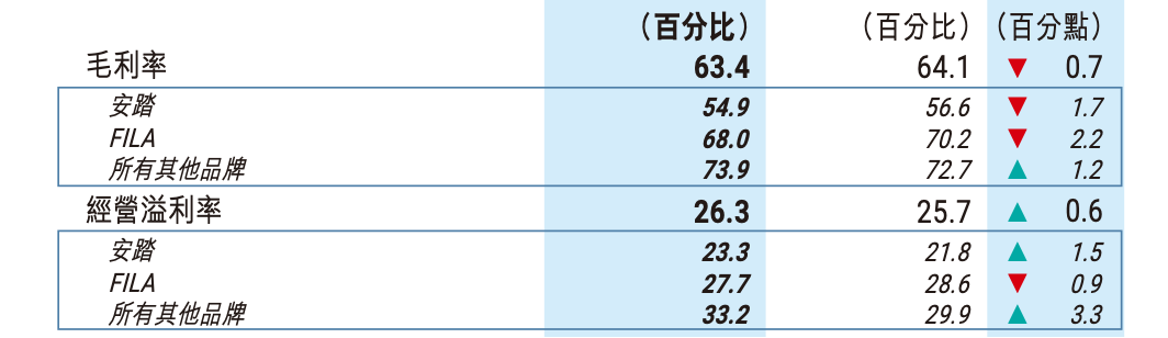 毛利率的下滑則與策略性地增強和提升產品功能和質量以致成本上升;以及主動地提升鞋類產品占比有關。
