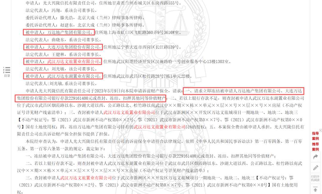 根據(jù)中國(guó)裁判文書(shū)網(wǎng)顯示,光大興隴信托于2023年5月9日向法院申請(qǐng),對(duì)上述萬(wàn)達(dá)集團(tuán)及萬(wàn)達(dá)地產(chǎn)集團(tuán)銀行存款約2.29億元或查封、凍結(jié)、扣押其他同等價(jià)值財(cái)產(chǎn);若以上銀行存款不足,則對(duì)武漢中央文化區(qū)文旅項(xiàng)目三宗地塊進(jìn)行查封。該請(qǐng)求獲得同意,并立即開(kāi)始執(zhí)行。