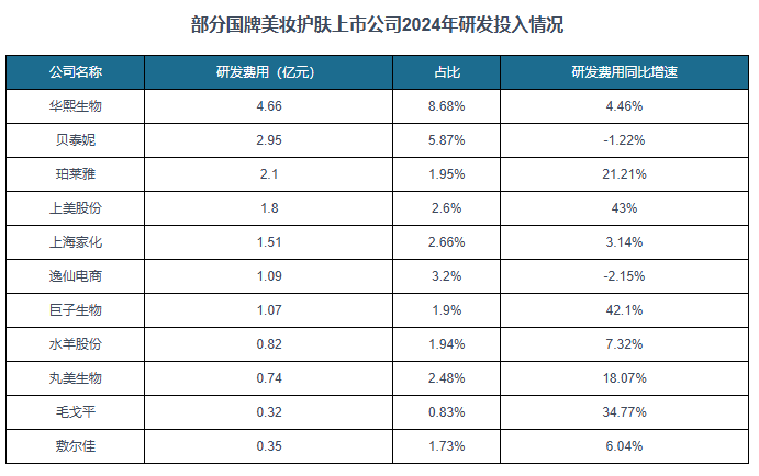 第四,是品牌們開始卷成分、卷科技,加速布局醫(yī)美。2024年,除了貝泰妮和逸仙電商,幾乎所有頭部美妝企業(yè)的研發(fā)投入都同比提升。