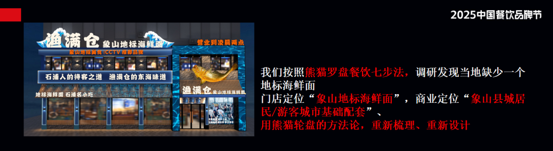 還有一個(gè)案例是寧波象山的漁滿倉(cāng),我們幫他做了一家象山地標(biāo)海鮮面,今年8月份開始試營(yíng)業(yè),第一天營(yíng)業(yè)額達(dá)10萬元,各種榜單排名都是第一名。很多人到店里充值,因?yàn)檫@些縣城消費(fèi)者認(rèn)為自己的消費(fèi)需要升級(jí),市面上終于有一家高級(jí)一點(diǎn)的面館了。