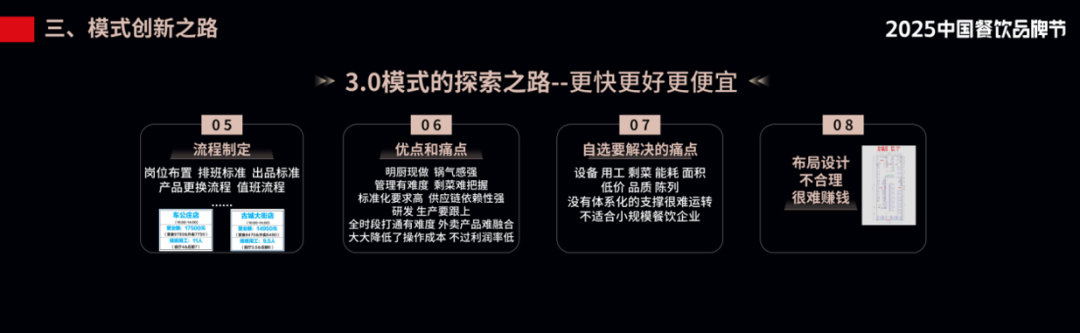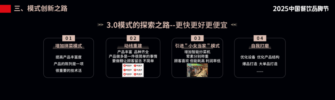 我們下一步就是2.0模型再升級(jí):升級(jí)炒菜機(jī)、價(jià)格帶拉升、打破菜系界限、不留戀老產(chǎn)品、外賣產(chǎn)品專治、環(huán)境干凈舒適、全時(shí)段經(jīng)營,現(xiàn)在已經(jīng)開始啟動(dòng)了。