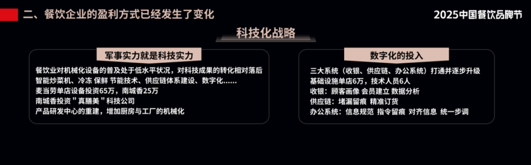 我們知道,軍事實(shí)力就是科技實(shí)力,其實(shí)餐飲業(yè)也提出科技化戰(zhàn)略、人才化戰(zhàn)略、數(shù)字化戰(zhàn)略。過去我不相信餐飲有科技化,現(xiàn)在覺得餐飲科技化才是核心競爭力。
