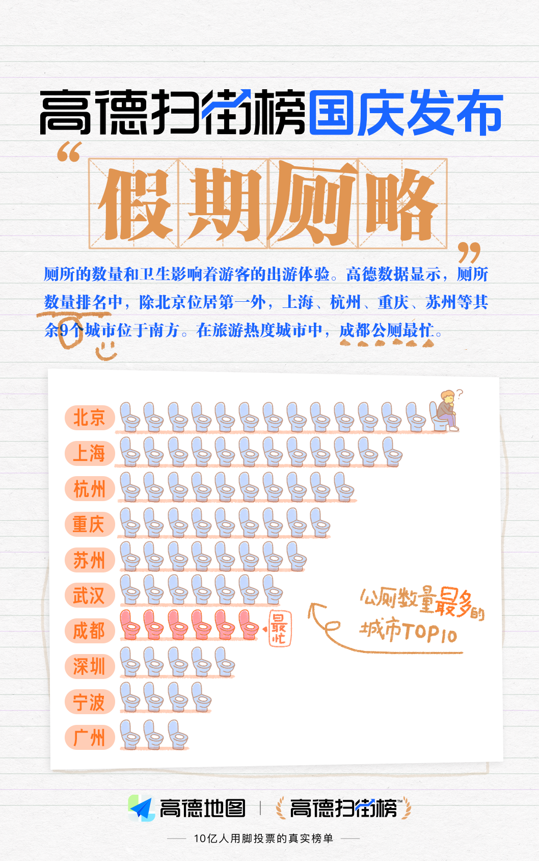 公益廣告告訴我們:“忙,都忙,忙點兒好!睂@位國慶假期忙翻了的電子牛馬,我只想誠懇地呼喚:能者多勞,能不能在掃街榜里加一個掃廁所榜,把“必拉廁所”和“別拉廁所”在地圖里標注出來。同為牛馬的都市打工人在此謝過了。