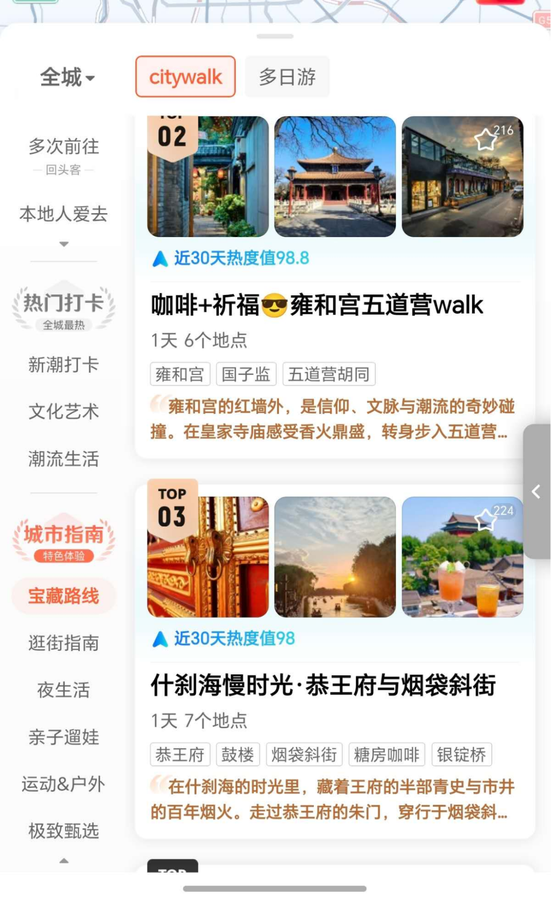 對于完全不想自己做攻略的P人而言,它又是一本速通寶典。打開掃街榜,下滑到城市指南,點擊寶藏路線,就能收獲若干條現(xiàn)成的線路,適合我這種旅行期間每天上午在酒店醒來才開始規(guī)劃當天行程的究極P人。