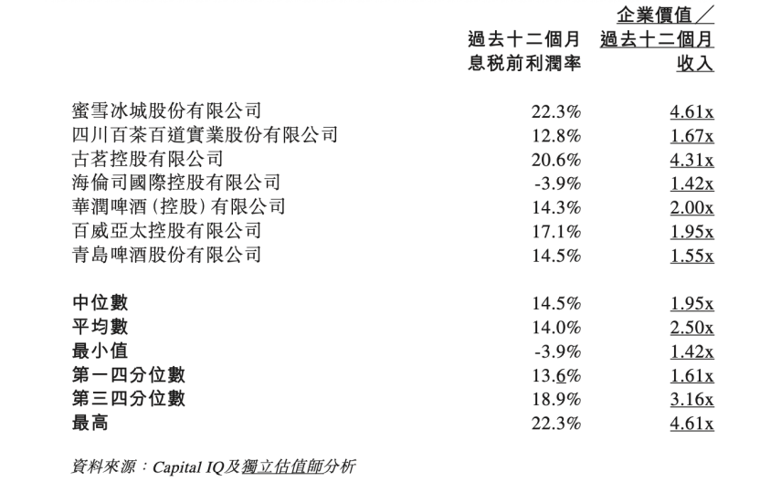 鮮啤福鹿家可比公司的倍數(shù),截自官方公告