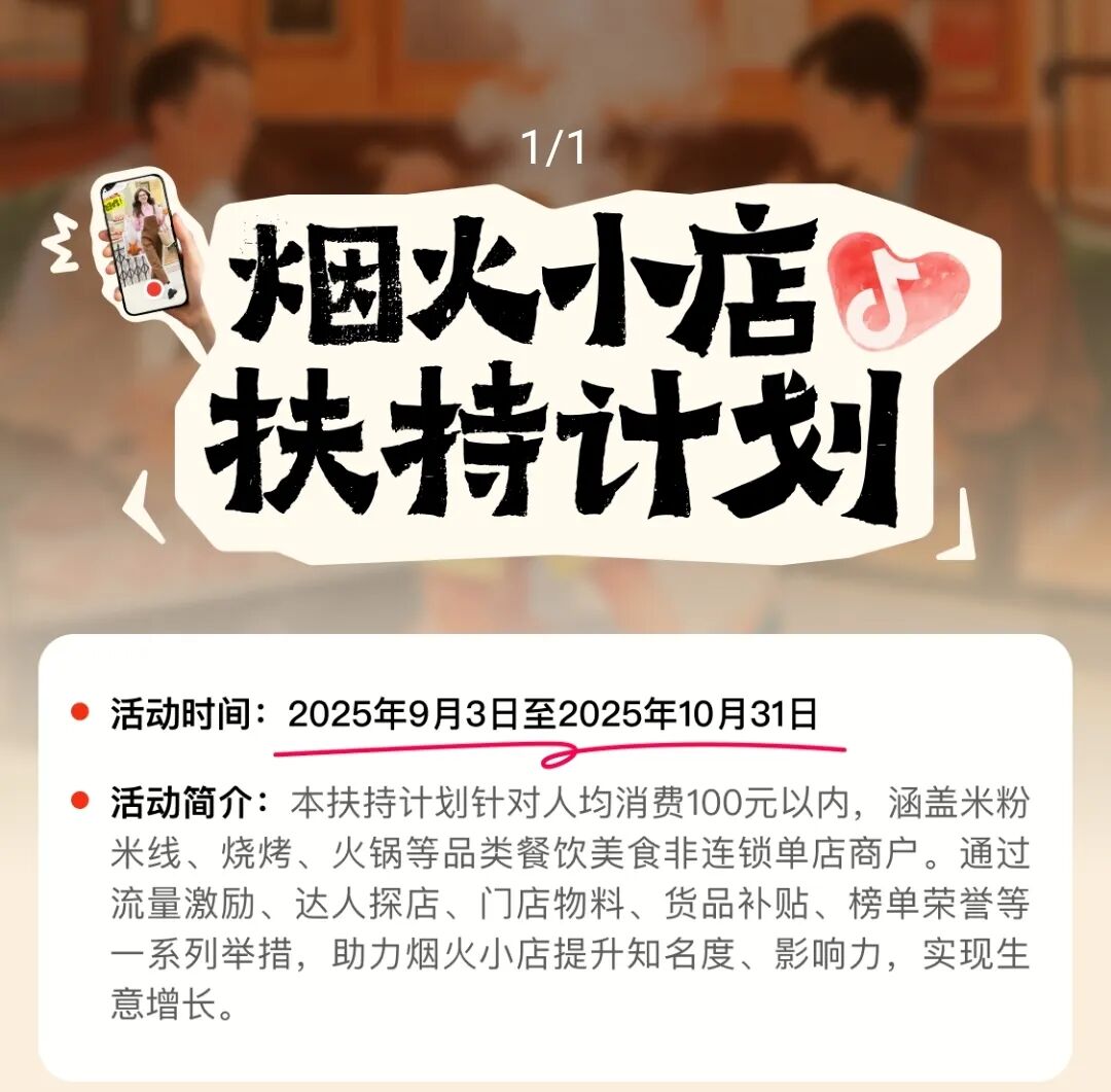 一來,今年9月10日,抖音生活服務(wù)宣布上線“煙火小店扶持計劃”,試圖通過流量激勵、達人探店、門店物料、貨品補貼、榜單榮譽等,讓更多客單均價低于100元的線下中小餐飲商家在抖音拿業(yè)績。