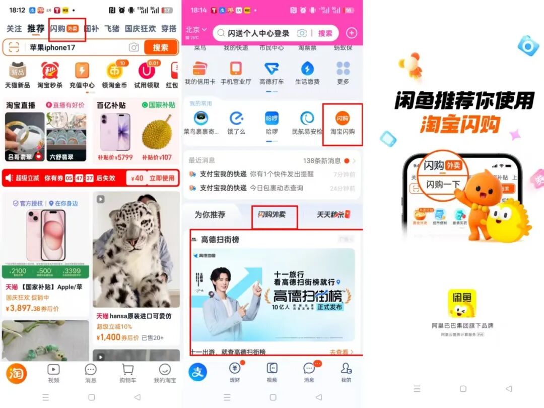 淘寶(月活9.2億)首頁開屏改為了“購物·外賣·旅行”,支付寶(月活過10億)為淘寶閃購開了首頁的一級入口,閑魚(月活過2億)則直接在開屏上為閃購代言——“閑魚推薦你使用淘寶閃購”。