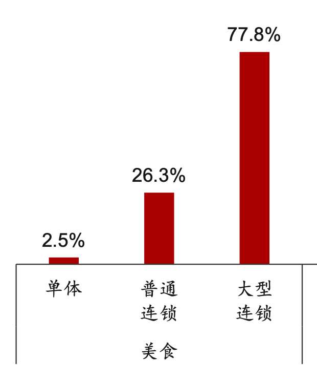 浙商證券曾在去年做過復盤,發(fā)現(xiàn)與達人合作的抖音生服餐飲商家中,大型連鎖商家的占比高達77.8%,普通連鎖商家占比26.3%,單體商家的占比低至2.5%。