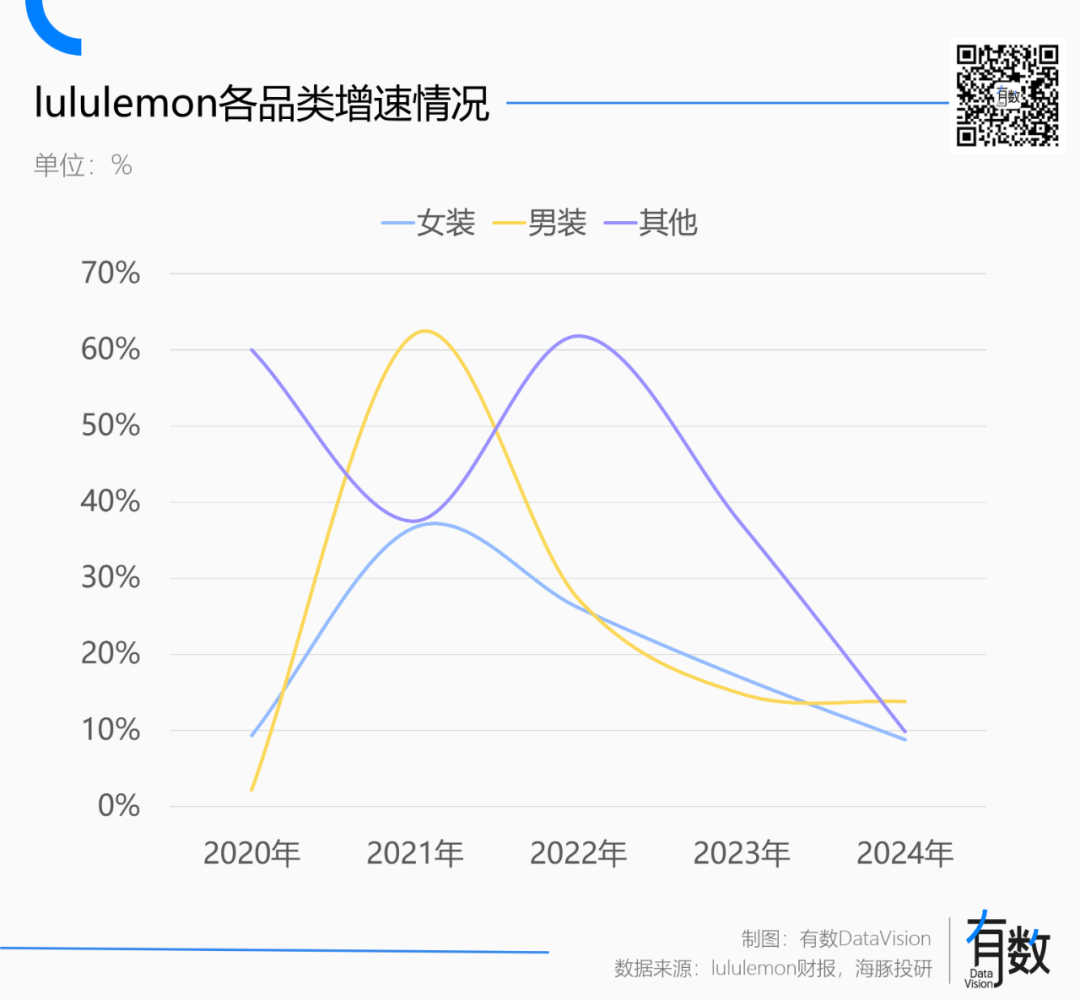 2018-2020財年,lululemon的女裝增速從24.3%下滑到9.3%,雖然疫情期間短暫回升,但很快回落到2024財年的9%。截至2025財年第一季度,lululemon女裝業(yè)務(wù)增速僅為7%。