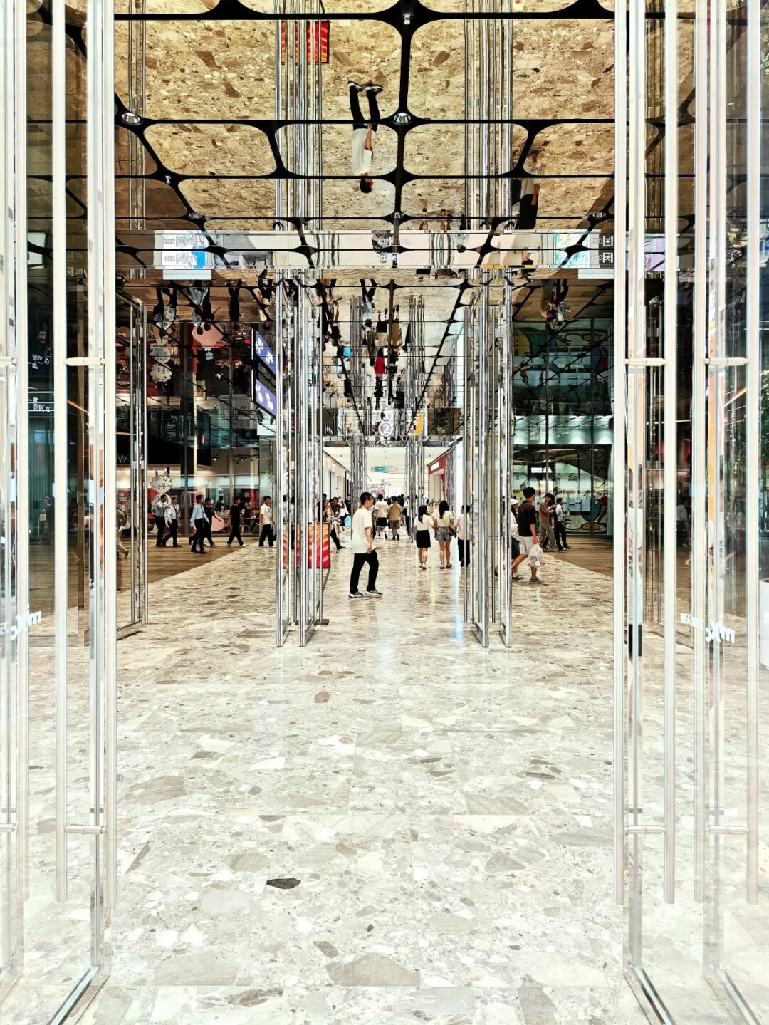 空間設(shè)計(jì),為呼應(yīng)密路網(wǎng)規(guī)劃,及形成從街區(qū)延伸至錢塘江的「風(fēng)路通道&視覺通廊」,室內(nèi)商場被規(guī)劃為從L1分隔開的南區(qū)與北區(qū),地面通道作為過道空間,并以頂部的鏡面設(shè)計(jì)弱化空間壓抑感,構(gòu)建出兼具功能與顏值的打卡區(qū)。
