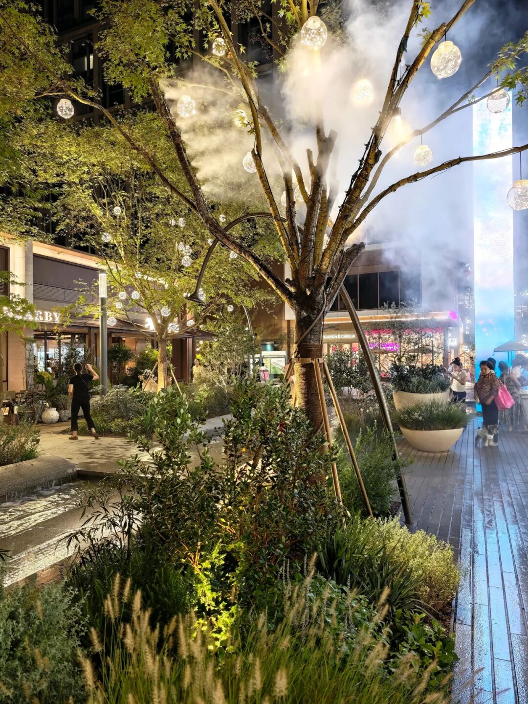 戶外街區(qū),亞奧萬象天地的里巷,擴(kuò)大了步道寬度以更適合人們游逛,綠植及水景更為豐富且層次多樣,并增加了休息區(qū)等人性化設(shè)施,指引標(biāo)識(shí)還進(jìn)行了主題化設(shè)計(jì),覆蓋整個(gè)街區(qū)的噴霧降溫裝置也能有效抵御夏日高溫。