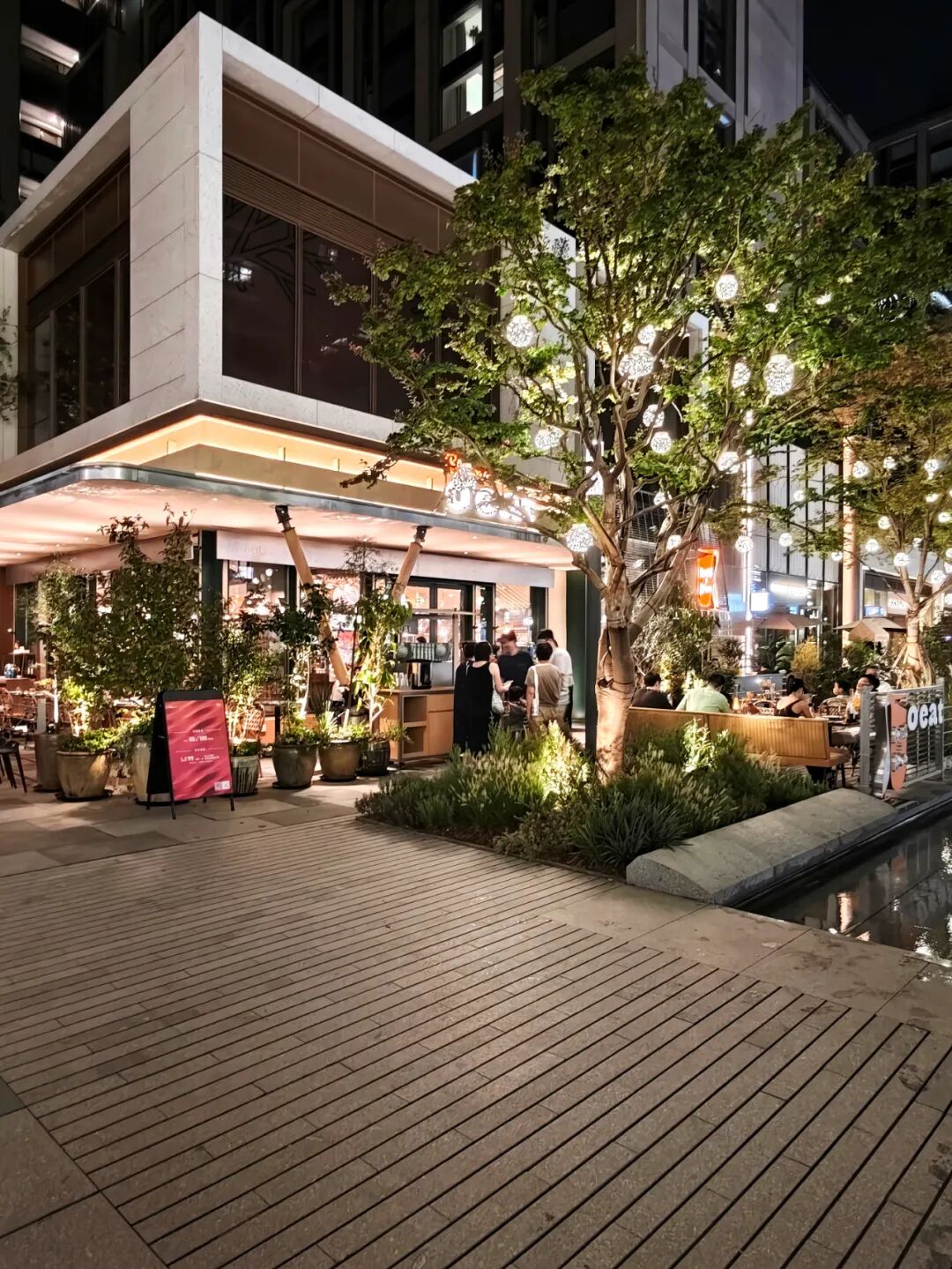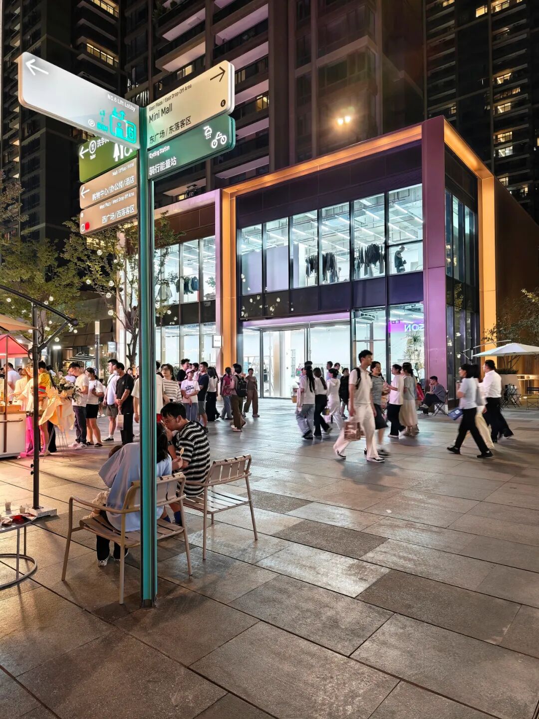 我們也有幸拍到視角從江邊越過大片農(nóng)田對(duì)望亞奧萬象天地的照片,且恰好在夜間遇見項(xiàng)目開業(yè)當(dāng)日的客流峰值。畢竟,人們都愿在舒適的夜間,迎著從江邊吹來的徐徐微風(fēng),來逛新商場特別是有chill氛圍的戶外街區(qū)。