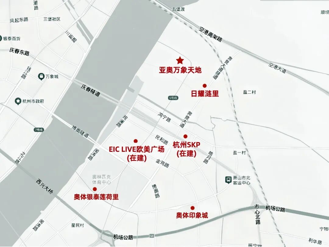 如果我們?cè)侔岩曇皵U(kuò)大,不限于單一項(xiàng)目,而是縱觀亞運(yùn)村及錢江世紀(jì)城核心區(qū),就會(huì)發(fā)現(xiàn)「彌補(bǔ)杭州高品質(zhì)街區(qū)商業(yè)空白」的亞奧萬象天地,并非一直是「孤軍奮戰(zhàn)」。
