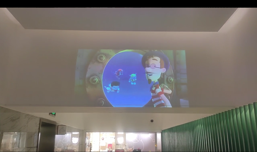 三樓業(yè)態(tài)布局的是兒童類商品,而在洗手間的公共走道的橫梁處,商場(chǎng)利用橫梁的高度和寬度,投放了動(dòng)畫片,使得兒童在家長(zhǎng)也上洗手間的短暫等候時(shí)間內(nèi),可以觀看,家長(zhǎng)也有了一個(gè)歇腳和寬心的場(chǎng)所。