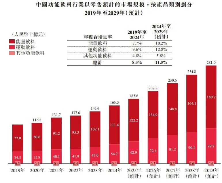 目前,中國(guó)軟飲行業(yè)仍是一個(gè)規(guī)模達(dá)萬(wàn)億的巨大市場(chǎng)。根據(jù)弗若斯特沙利文報(bào)告,2024年中國(guó)軟飲行業(yè)零售額約達(dá)1.3萬(wàn)億元,是全球第二大軟飲消費(fèi)市場(chǎng)。在這個(gè)龐大市場(chǎng)中,功能飲料已成為增長(zhǎng)最快的板塊。2019年-2024年,功能飲料市場(chǎng)規(guī)模的年復(fù)合增長(zhǎng)率達(dá)8.3%,高于同期整體軟飲市場(chǎng)的4.7%。