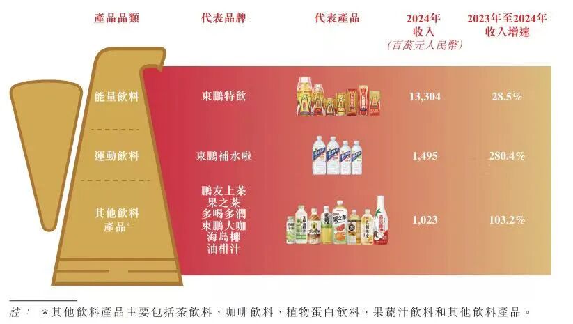 目前,能量飲料仍是東鵬飲料的主要收入來(lái)源,但占比已從2023年的91.9%下降至2024年的84.0%。與此同時(shí),東鵬飲料的運(yùn)動(dòng)飲料業(yè)務(wù)迅速崛起,2023年-2024年收入增速高達(dá)280.4%,占2024年總收入的9.4%。其他飲料產(chǎn)品同樣表現(xiàn)不俗,2023年-2024年收入增速達(dá)103.2%。