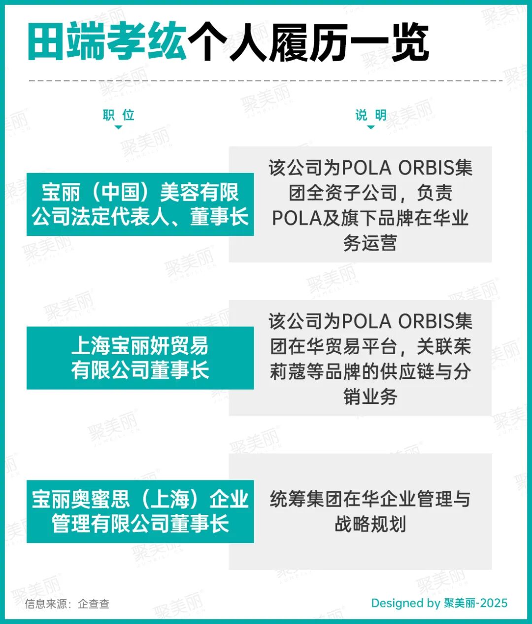 據(jù)企查查顯示,田端孝纮目前擔(dān)任三家公司的董事長(zhǎng),分別為寶麗(中國(guó))美容有限公司(以下簡(jiǎn)稱:寶麗中國(guó))、上海寶麗妍貿(mào)易有限公司(以下簡(jiǎn)稱:上海寶麗妍)、寶麗奧蜜思(上海)企業(yè)管理有限公司。其中寶麗中國(guó)為POLA ORBIS集團(tuán)全資子公司,負(fù)責(zé)POLA及旗下品牌在華業(yè)務(wù)運(yùn)營(yíng);上海寶麗妍則為POLA ORBIS集團(tuán)在華貿(mào)易平臺(tái),關(guān)聯(lián)茱莉蔻等品牌的供應(yīng)鏈與分銷業(yè)務(wù)。