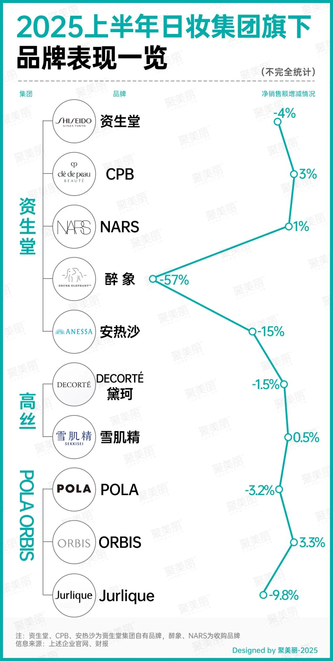 其實(shí),茱莉蔻及其母公司POLA ORBIS集團(tuán)當(dāng)前的處境只是日妝發(fā)展受阻的一個(gè)縮影。此前聚美麗曾在《暴跌、全線下滑?日妝巨頭們敗了!》一文中,分析了2025上半年日妝集團(tuán)的相關(guān)業(yè)績(jī)。