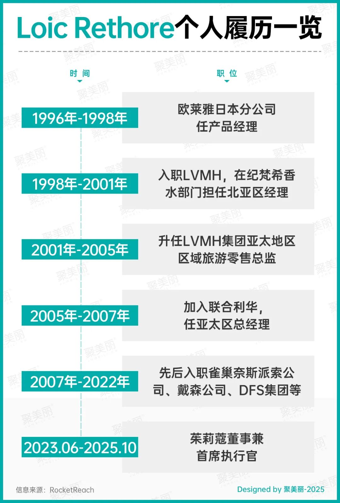 Loic Rethore在1996年-1998年期間,擔(dān)任歐萊雅日本分公司的產(chǎn)品經(jīng)理;隨后在LVMH工作的7年間,負(fù)責(zé)紀(jì)梵希香水部門的北亞區(qū)經(jīng)理,并升任亞太地區(qū)旅游零售總監(jiān)。此外還在雀巢、戴森、DFS集團(tuán)等任職。在2023年6月至2025年10月期間就任茱莉蔻董事兼首席執(zhí)行官。