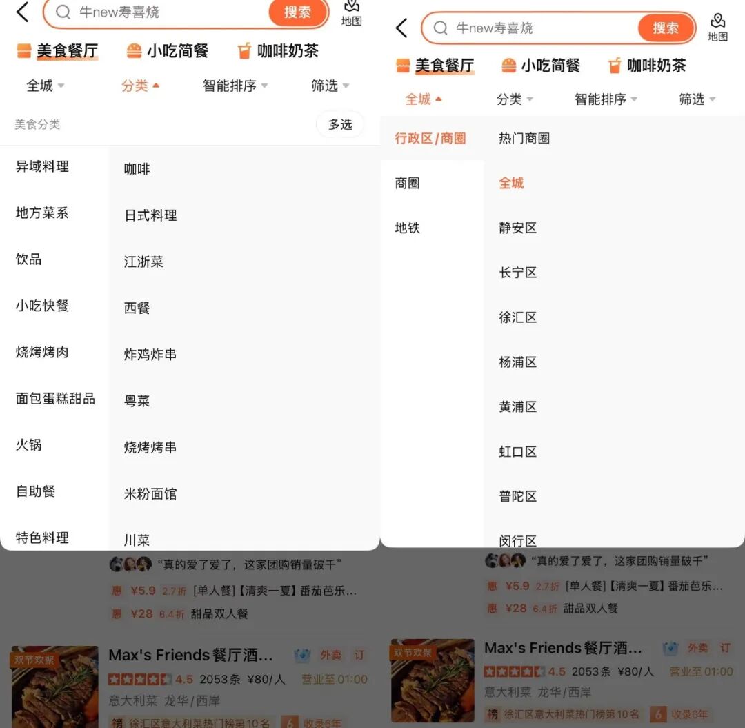 大眾點評按地方菜系、熱門商圈等更細分的維度給餐廳分類
