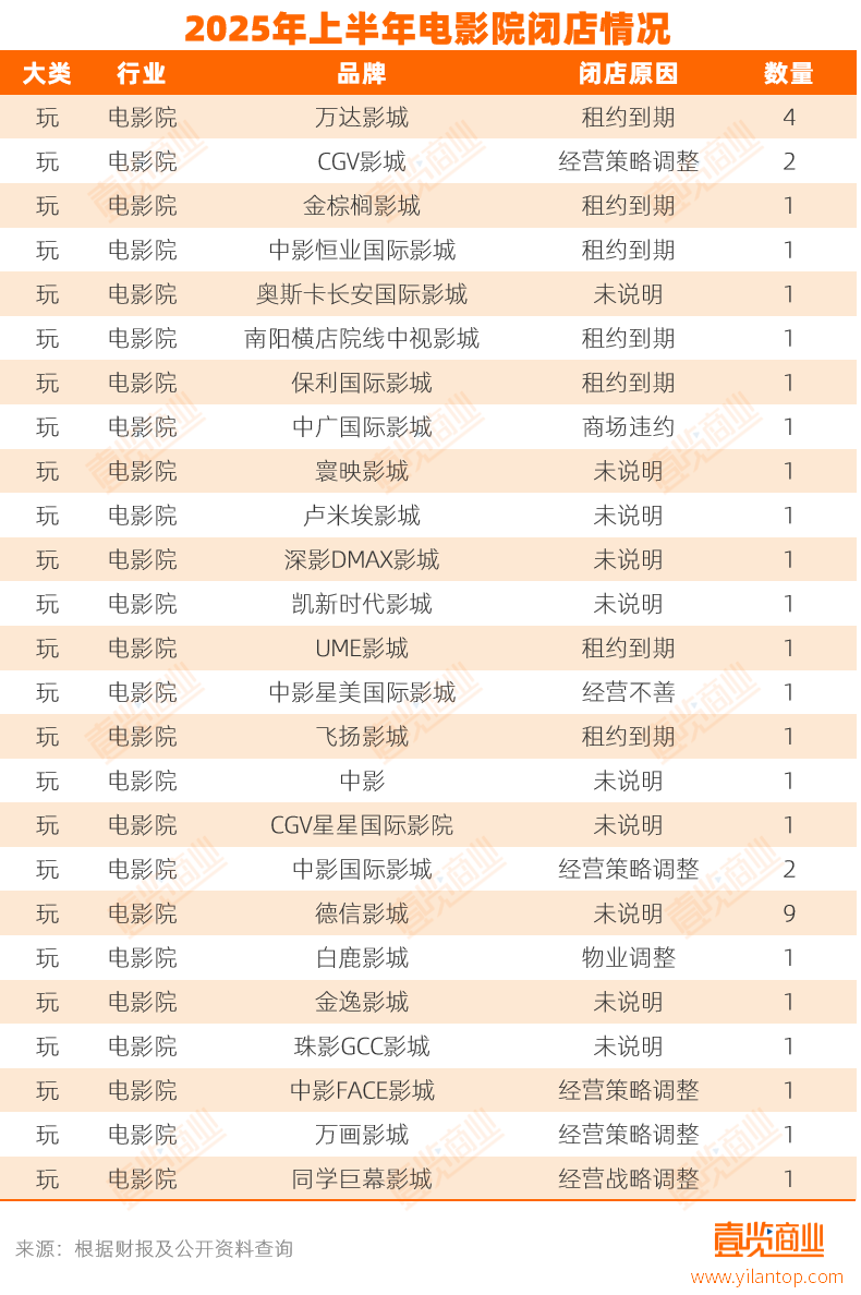 據(jù)壹覽商業(yè)不完全統(tǒng)計(jì),2025年上半年,全國(guó)至少有38家電影院關(guān)閉。3月1日,UME影城(北京華星店)宣布閉店,這家影業(yè)已經(jīng)經(jīng)營(yíng)22年,是北京第一家引入IMAX的影院;CGV長(zhǎng)沙麓山店、上海盧米埃大融城影城、佛山兆陽(yáng)保利國(guó)際影城等,也都選擇了關(guān)門(mén)。
