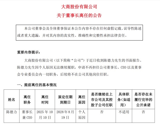 10月10日,大商股份(600694.SH)發(fā)布了關(guān)于“大商股份有限公司關(guān)于董事長(zhǎng)離任的公告”,確認(rèn)了公司董事長(zhǎng)兼CEO陳德力離任的消息。