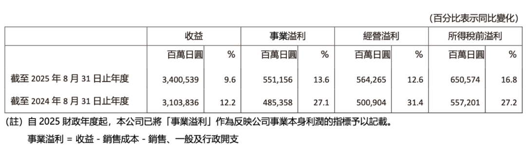 2025財年,優(yōu)衣庫綜合收益總額達(dá)到34005億日元,較上一財年增長9.6%,這一規(guī)模在全球服飾零售行業(yè)中持續(xù)保持領(lǐng)先地位。作為衡量核心盈利能力的關(guān)鍵指標(biāo),事業(yè)溢利總額同比增長13.6%至5511億日元,母公司擁有人應(yīng)占溢利以16.4%的增速攀升至4330億日元,盈利增速顯著高于收入增長。