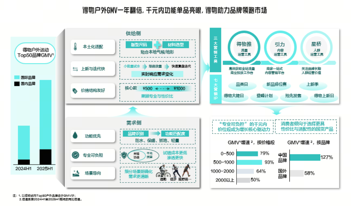 Z世代的新消費(fèi)特征為品牌提供了新增長(zhǎng)動(dòng)力!秷(bào)告》顯示,猛犸象、迪桑特、可隆、薩洛蒙、凱樂石、駱駝、伯希和等1300多個(gè)戶外品牌在得物App通過新品、新玩法快速打開市場(chǎng),并推動(dòng)熱度向長(zhǎng)期銷量轉(zhuǎn)化,完成從爆款到經(jīng)典的代表作沉淀。2025年至今,得物戶外行業(yè)GMV同比去年增長(zhǎng)了100%。
