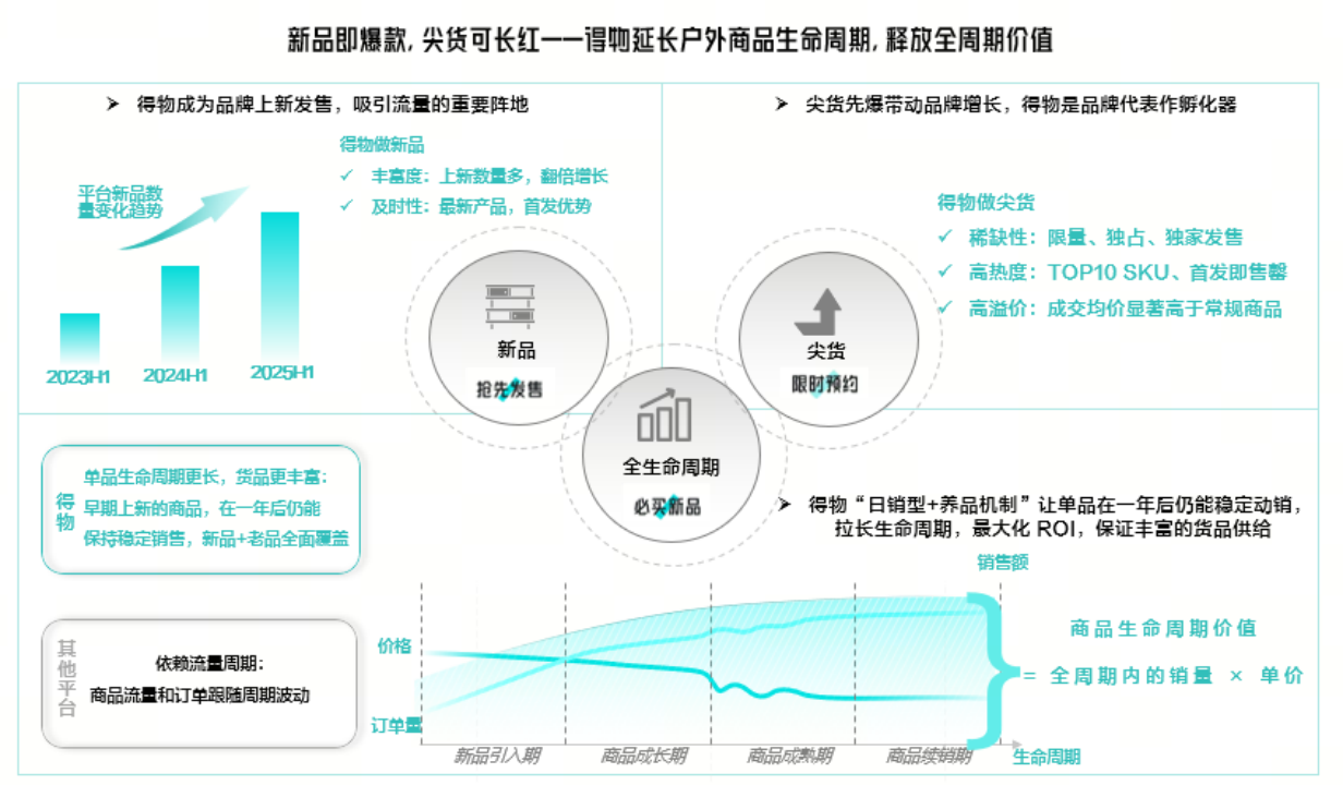 在巨大的市場(chǎng)潛力下,Z世代為戶外品牌提供強(qiáng)勁的新增長(zhǎng)動(dòng)力。截至目前,1300多個(gè)戶外品牌在得物App通過首發(fā)新品、尖貨限時(shí)預(yù)約、日銷和長(zhǎng)期養(yǎng)品機(jī)制,推動(dòng)高熱度向長(zhǎng)期高銷量轉(zhuǎn)化,完成從爆款到經(jīng)典代表作的沉淀。