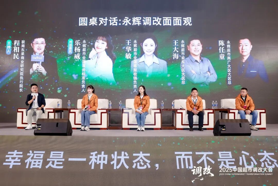 在10日下午的“永輝調(diào)改面面觀”圓桌對話環(huán)節(jié),聯(lián)商東來文化執(zhí)行院長程相民與永輝超市全國服務(wù)標準負責人樂楊威、永輝超市全國客服收銀負責人王華敏、永輝超市渝東大區(qū)大區(qū)總王大海、永輝超市兩廣大區(qū)大區(qū)總陳任童四位嘉賓,圍繞“永輝調(diào)改的個人收獲及心得”“服務(wù)客服等提升的具體措施”“如何看待調(diào)改質(zhì)疑”“下階段工作重點”“給調(diào)改企業(yè)的建議”等問題進行了交流分享。