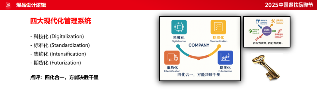 第二個(gè)是標(biāo)準(zhǔn)化。我們所有的管理和研發(fā)全都要有標(biāo)準(zhǔn),確保品質(zhì)如一。第三個(gè)是集約化,通過(guò)集團(tuán)集采等手段,實(shí)現(xiàn)成本最優(yōu)。第四個(gè)是期貨化,我提出最新的理念就是“期貨研發(fā)”。我在肯德基工作的時(shí)候,產(chǎn)品需要經(jīng)歷18個(gè)月的研發(fā)周期,為市場(chǎng)測(cè)試、食安管控和資源整合留足時(shí)間。最后我們還有金融化,運(yùn)用金融思維和工具,為產(chǎn)品與品牌賦能。