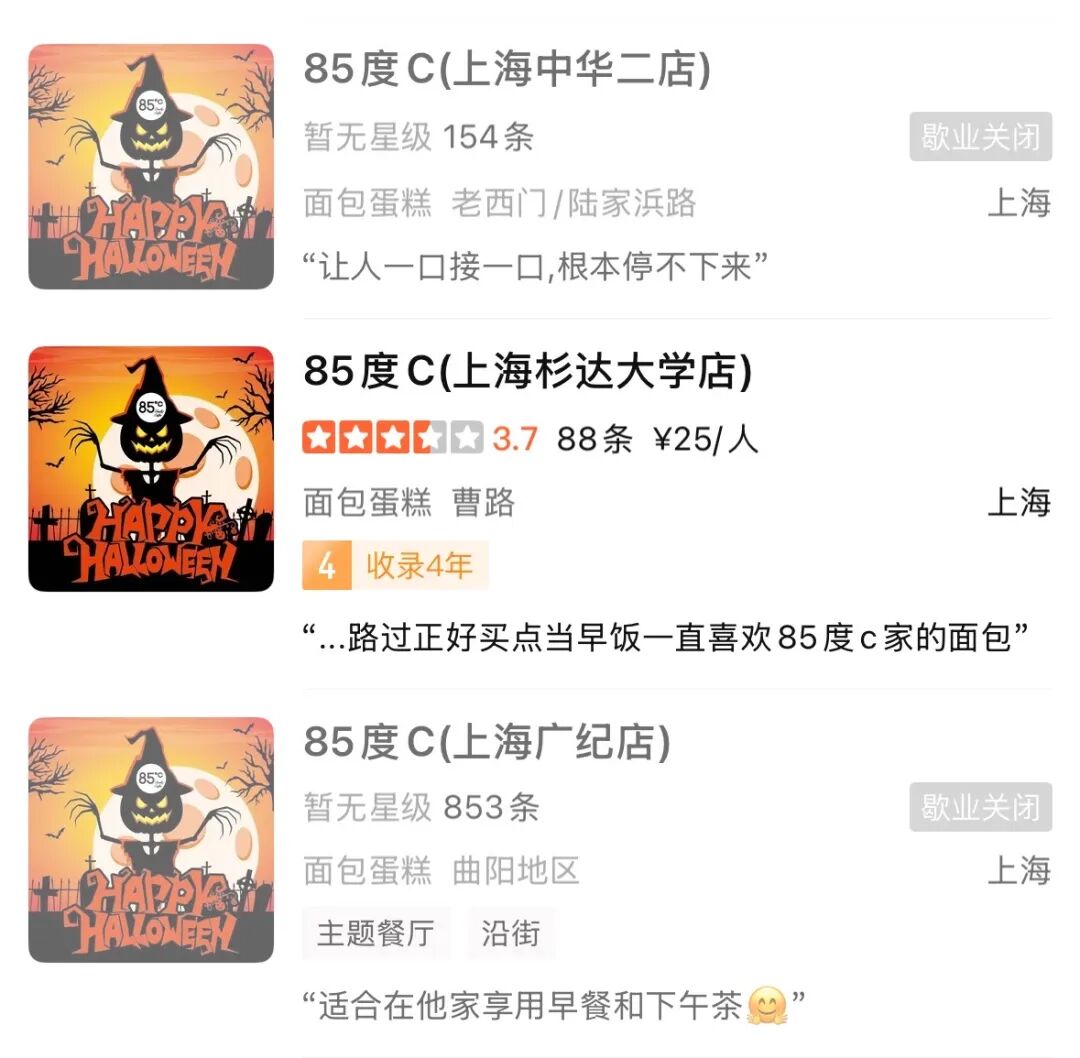 值得注意的是,這場(chǎng)關(guān)店計(jì)劃已從“紙面”落地為實(shí)際行動(dòng),且關(guān)店范圍正從非核心區(qū)域向華東核心市場(chǎng)蔓延。在上海,大眾點(diǎn)評(píng)等平臺(tái)顯示,部分門店已標(biāo)注“暫停營(yíng)業(yè)”。