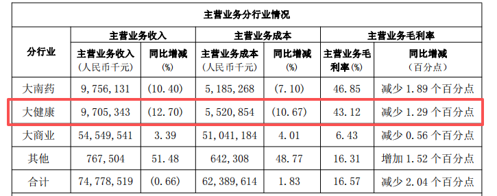 行業(yè)的增速頹勢(shì)也直接反映在了作為龍頭企業(yè)的王老吉業(yè)績(jī)上。白云山披露的2024年財(cái)報(bào)顯示,主要收入來(lái)源于王老吉涼茶的大健康板塊2024年主營(yíng)業(yè)務(wù)收入約為97.05億元,同比下滑12.7%,毛利率同比減少1.29個(gè)百分點(diǎn)至43.12%。