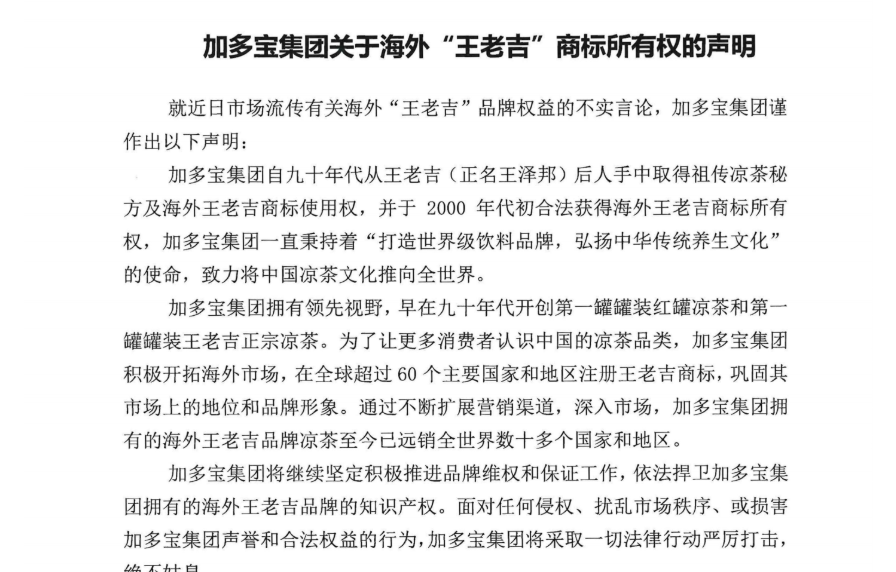 聲明進(jìn)一步指出,“王老吉”商標(biāo)所有人為白云山,其歷史沿革資料、知識(shí)產(chǎn)權(quán)權(quán)屬的法律文件完整清晰。白云山、王老吉大健康公司在全球100多個(gè)國(guó)家和地區(qū)完成“王老吉”、“WALOVI”等系列商標(biāo)注冊(cè)。