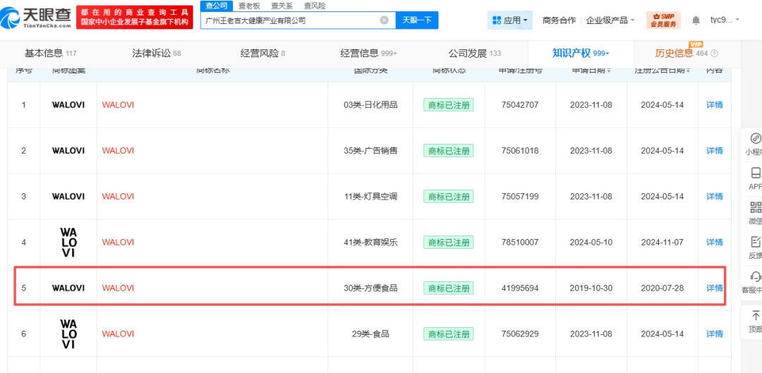 天眼查顯示,“WALOVI”商標(biāo)由王老吉大健康公司申請(qǐng)注冊(cè)注冊(cè),注冊(cè)類別包括方便食品、食品等。