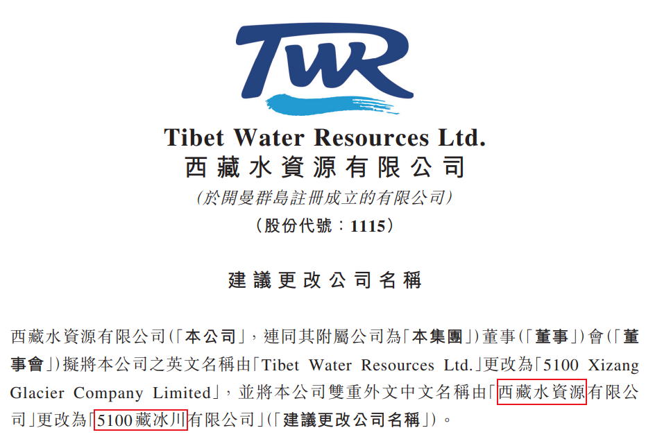 上周,5100西藏冰川礦泉水母公司西藏水資源(01115.HK)發(fā)布公告稱,公司名稱將從“西藏水資源有限公司”變更為“5100藏冰川有限公司”。