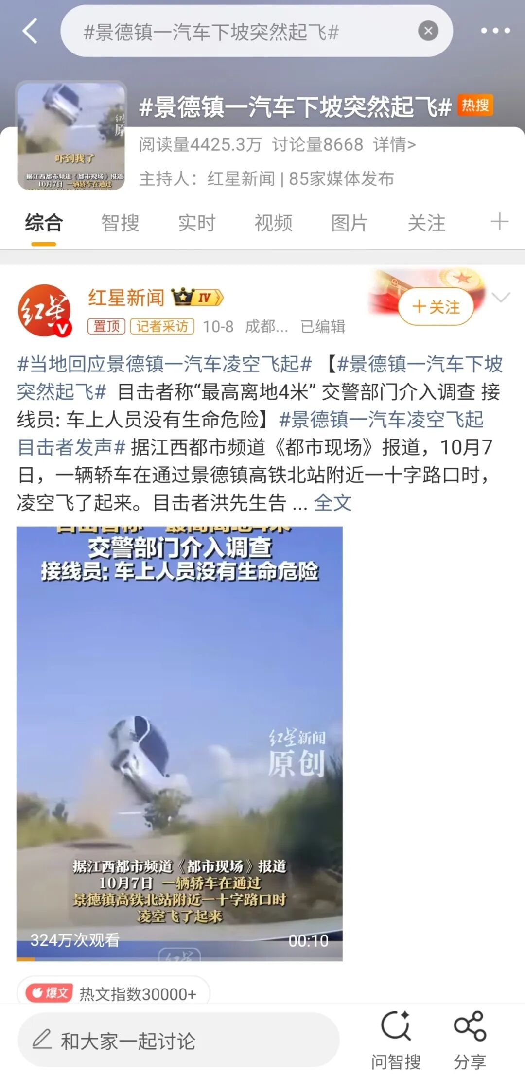 更加直觀的一個(gè)例子是,不久前的國慶假期,景德鎮(zhèn)有一輛汽車在下坡時(shí)突然“起飛”,還沖上了微博熱搜。