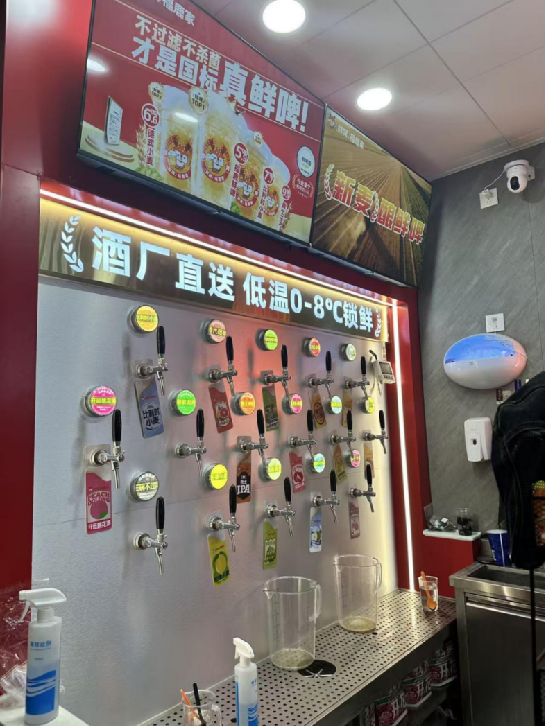 打酒區(qū)上方,“酒廠直送,低溫0-8℃鎖鮮”的標(biāo)語醒目。店主介紹,店內(nèi)所有鮮啤均由總部工廠冷鏈直配,保質(zhì)期僅一個(gè)月,賣不完會(huì)直接銷毀。