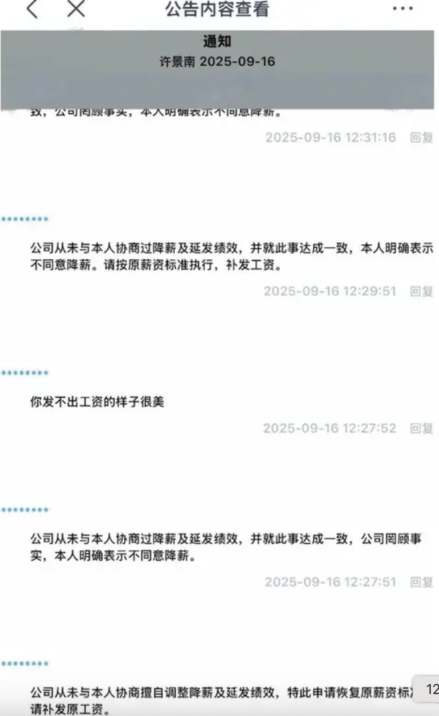 有受訪員工表示,9月11號(發(fā)薪日前四天)確實有開會講過降薪一事并提及降薪的幅度。但當時沒有征求大家同意的環(huán)節(jié),會議也不是全員參加。會后沒發(fā)布正式的文件公告、也未進行一對一溝通,大家月中發(fā)完工資以后董事長才發(fā)了那個落款為9月16號的通知。
